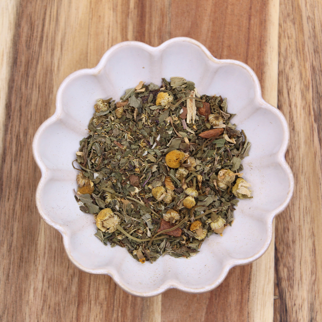 Organic peppermint, chamomile flower, licorice root, and cinnamon.